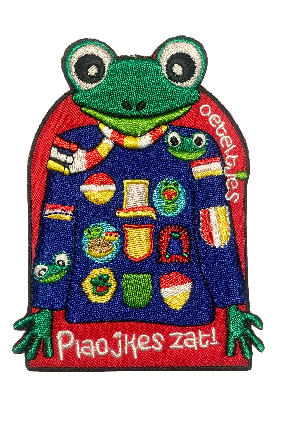 Op dit embleem zie je een kikker in een echte Bossche kiel, compleet met diverse emblemen. De achtergrond is rood en de tekst “Plaojkes zat!” staat duidelijk weergegeven.